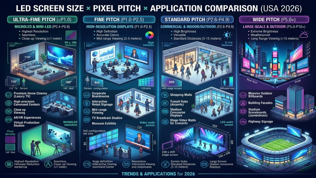 LED Screen Size × Pixel Pitch × Application Comparison (EE.UU 2026)