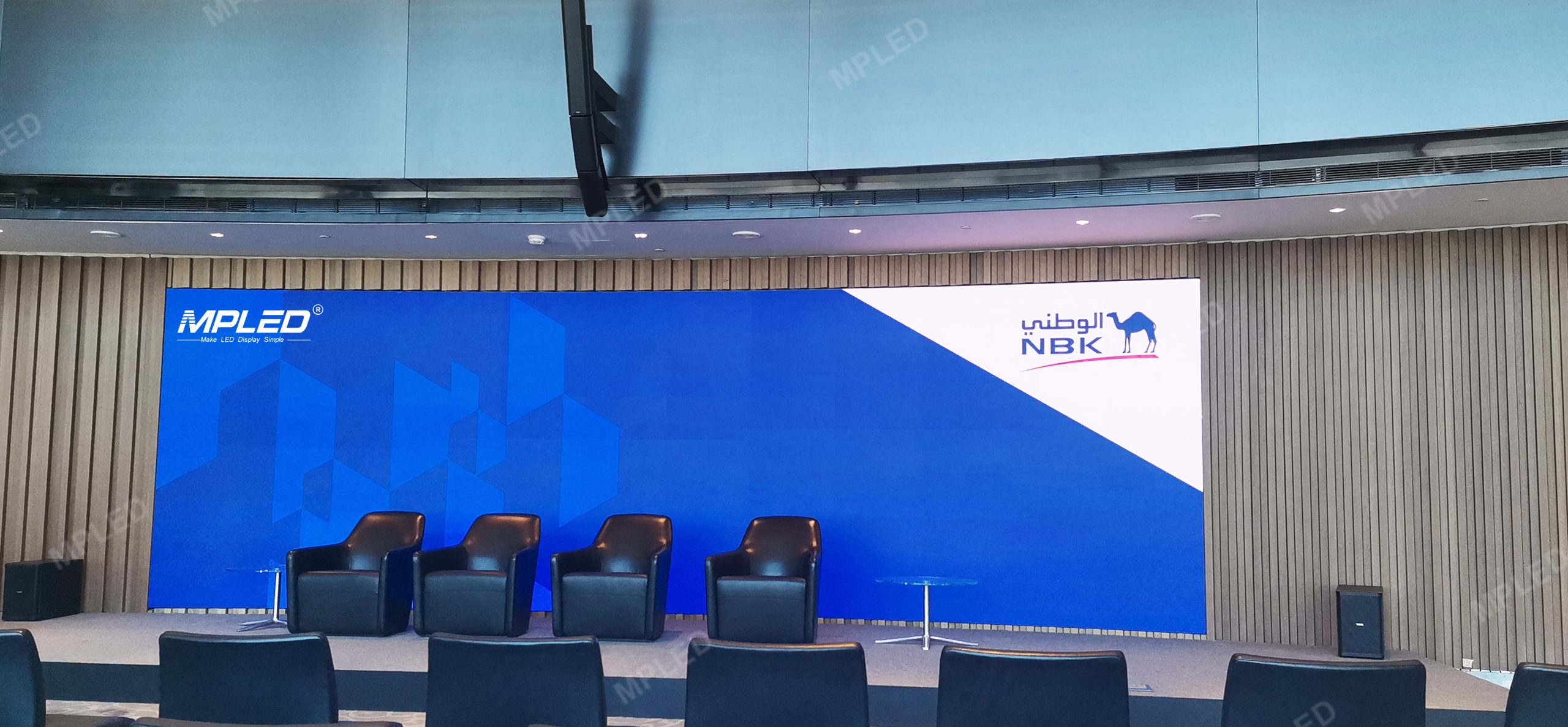 Dans la tour NBK, Les écrans LED de la série SN P1.25 de MPLED ont été installés, avec un écran central mesurant 7.68 mètres par 2.88 mètres et deux écrans latéraux mesurant 3.84 mètres par 1.92 mètres chacun. Réputé pour son ultra-mince, conception légère, épissage transparent, et un taux de rafraîchissement élevé, La série SN a fourni des expériences audiovisuelles exceptionnelles pour les conférences et les réceptions.