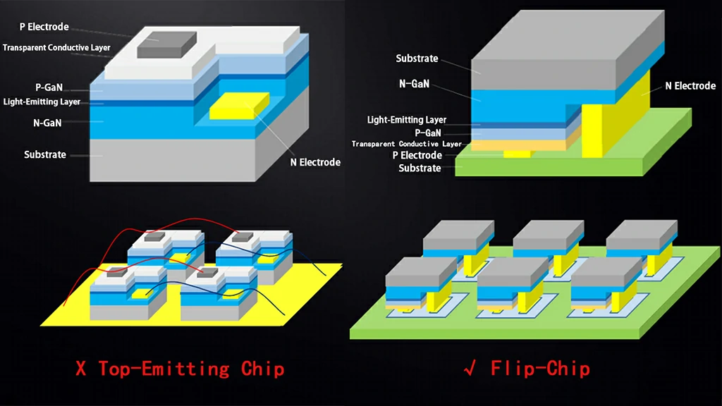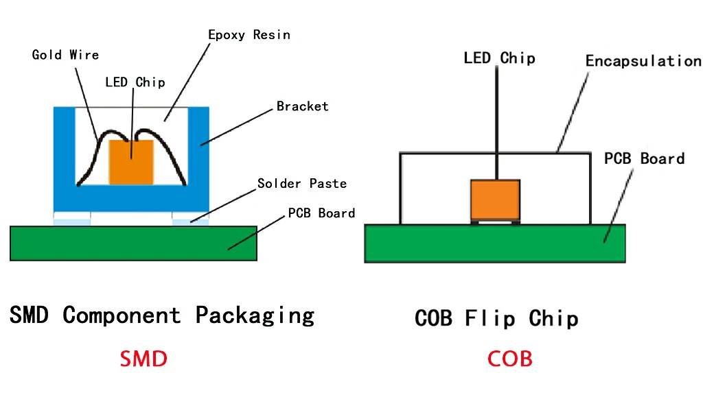 • COB package: the chip is directly encapsulated on the substrate, better heat dissipation, especially suitable for ultra-small pitch and high-end display scenes.