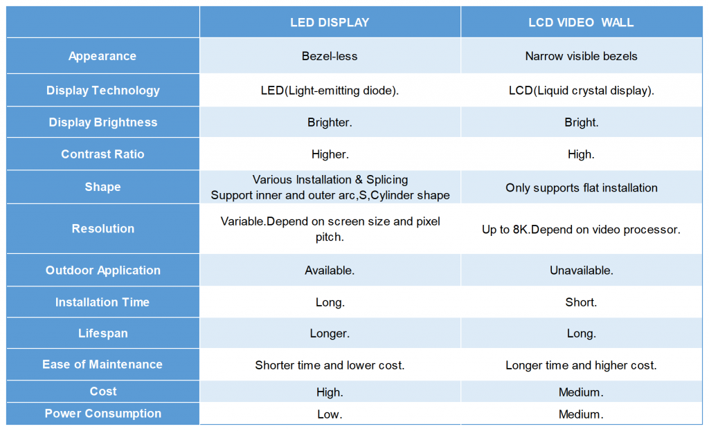 When deciding between LED screens and LCD video walls, consider your needs, budget, and installation preferences. As a professional solution provider, we deliver top-notch, innovative, and tailored display solutions to meet your business demands.