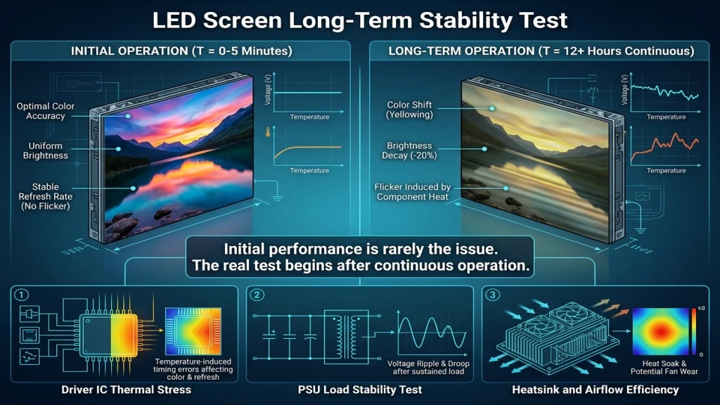 This is why professional evaluation includes testing under full brightness for extended periods. A system that cannot manage heat effectively will not maintain performance over time.