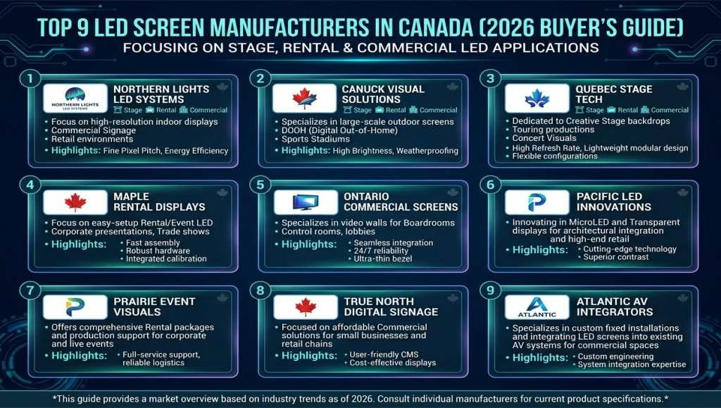 Explore the top LED screen manufacturers in Canada for 2026. Compare pixel pitch, applications, and supplier capabilities for rental, DOOH, and commercial LED display projects.